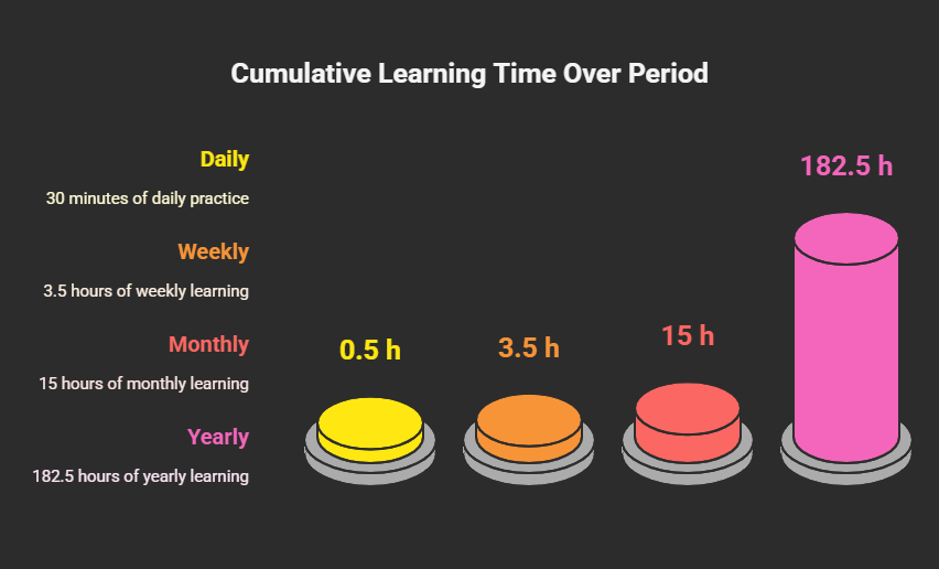 Consistent learning over time has a profound impact. By dedicating just 30 minutes daily to a skill like coding, learning a language, or playing an instrument, you accumulate significant progress. Here's how it adds up: